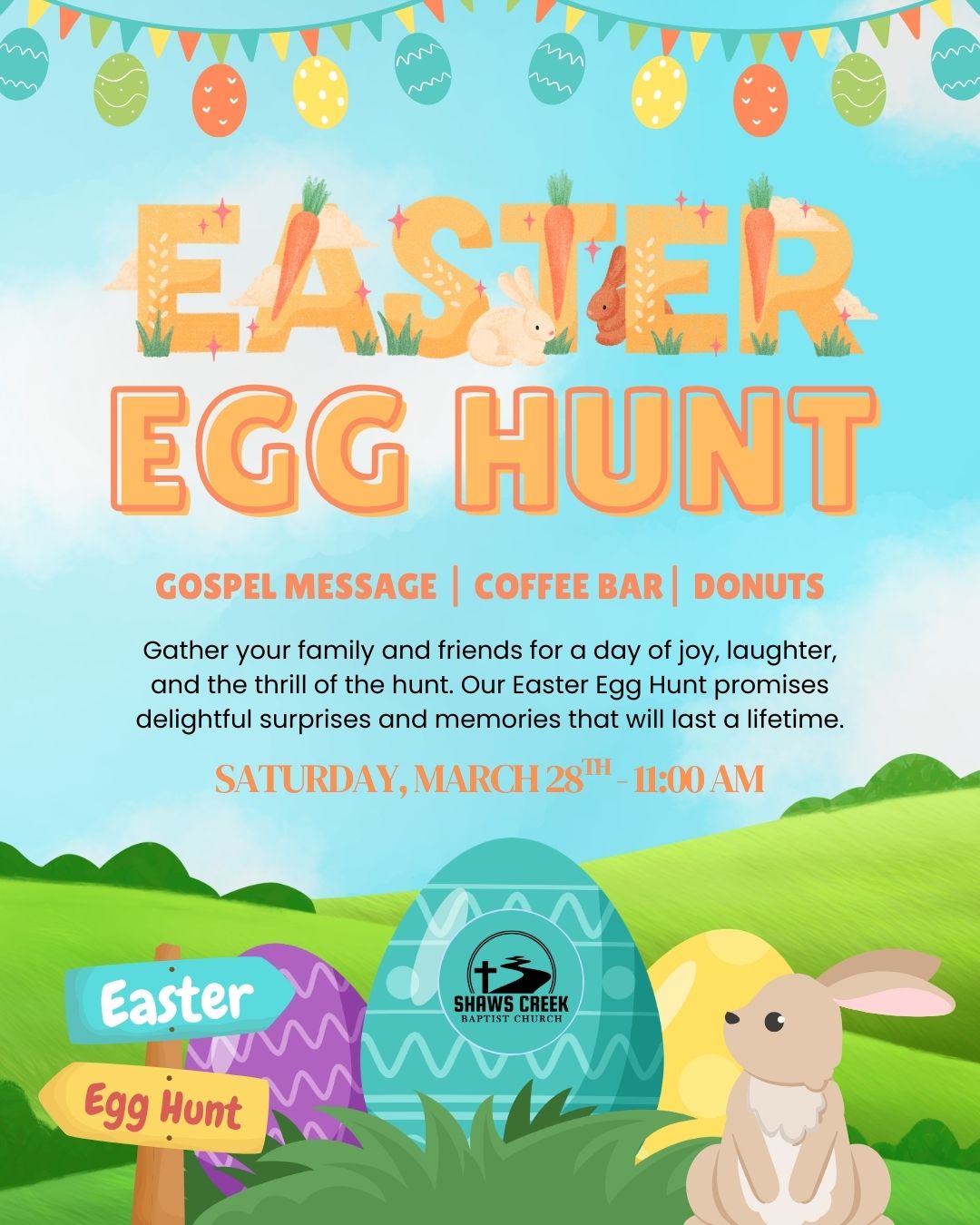 Join us for our annual Easter Egg Hunt! Eggs will be hidden all over the campus for the kids to find. There will be coffee and donuts provided as well. We will have a small Gospel Lesson.