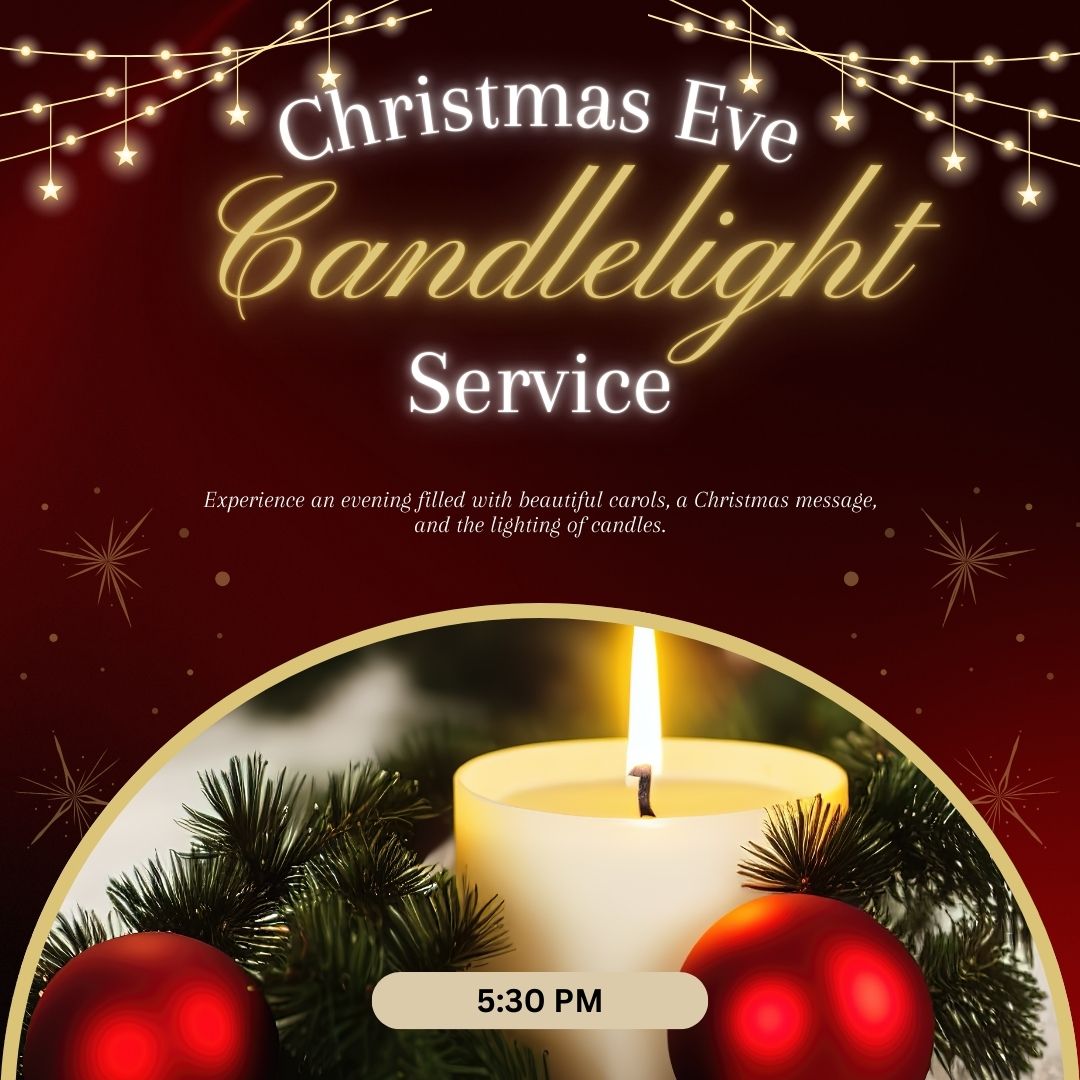 Join us on Christmas Eve for our annual candle lighting service. Come and sing familiar carols, hear the Christmas story, and light your candle! This will be at 5:30 PM. There will be no nursery or Children's Church